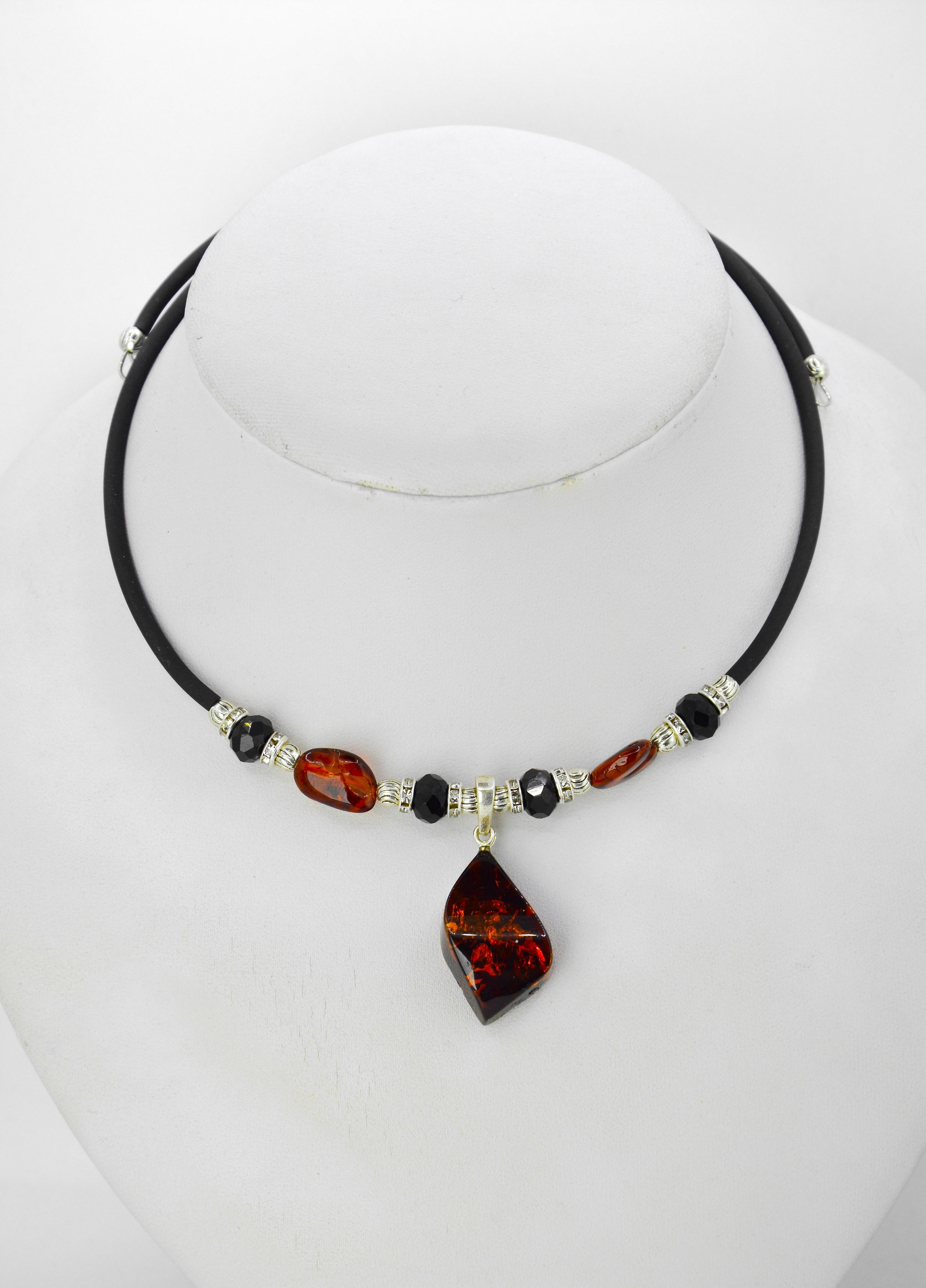 Безразмерное колье без замка , на каучуковой основе с натуральным янтарем и бижутерной фурнитурой .