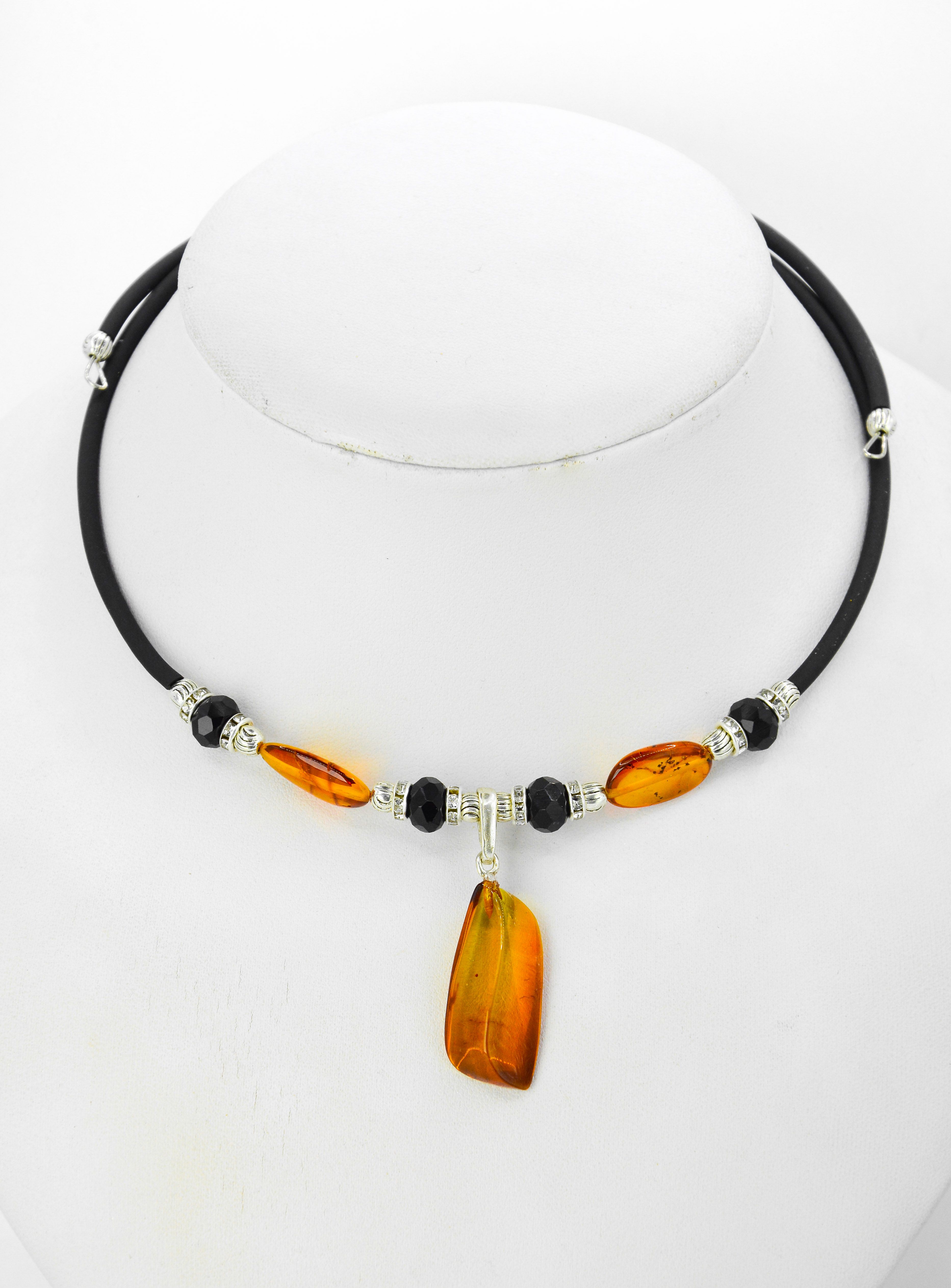 Безразмерное колье без замка , на каучуковой основе с натуральным янтарем и бижутерной фурнитурой .