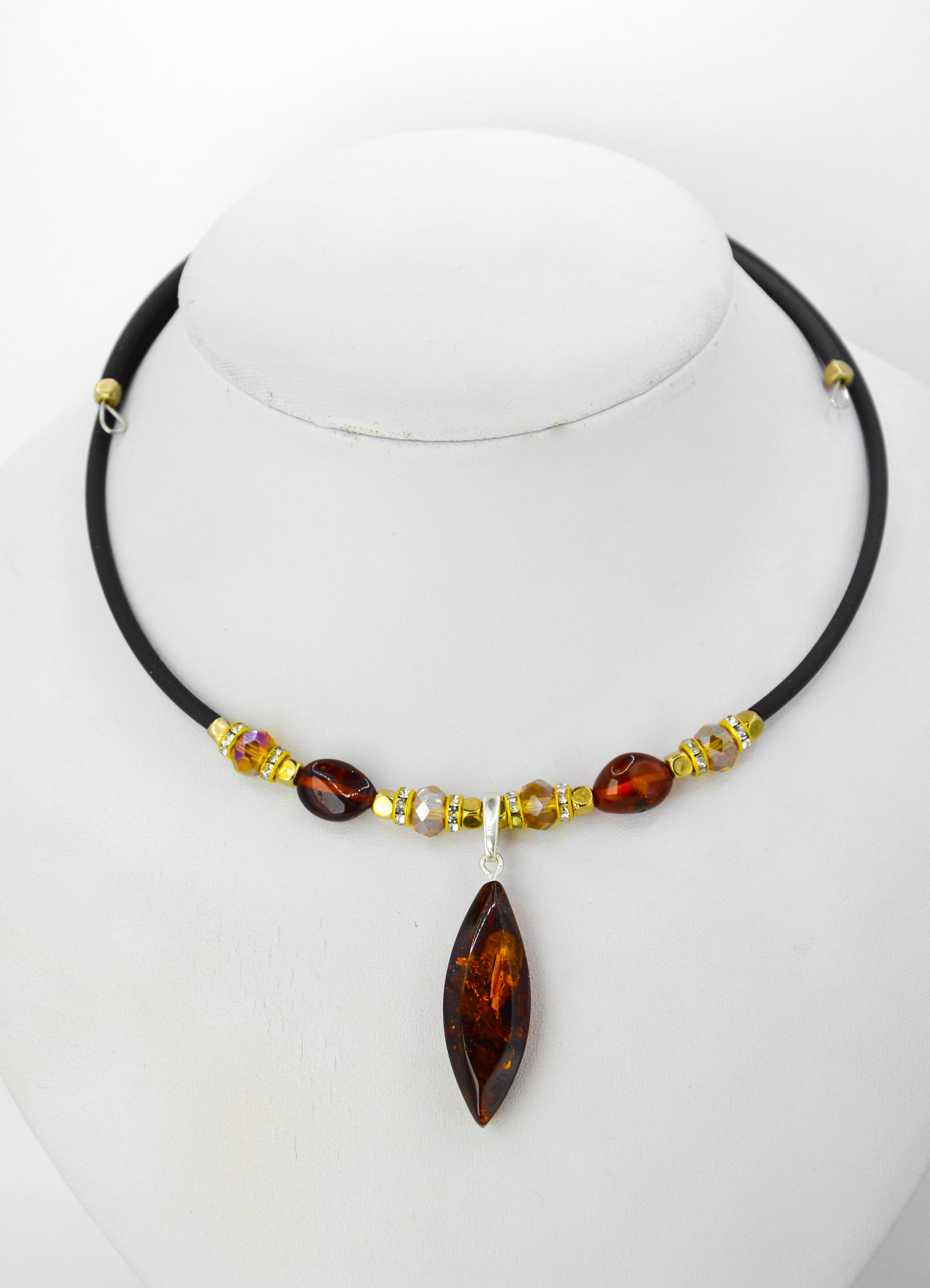 Безразмерное колье без замка , на каучуковой основе с натуральным янтарем и бижутерной фурнитурой .