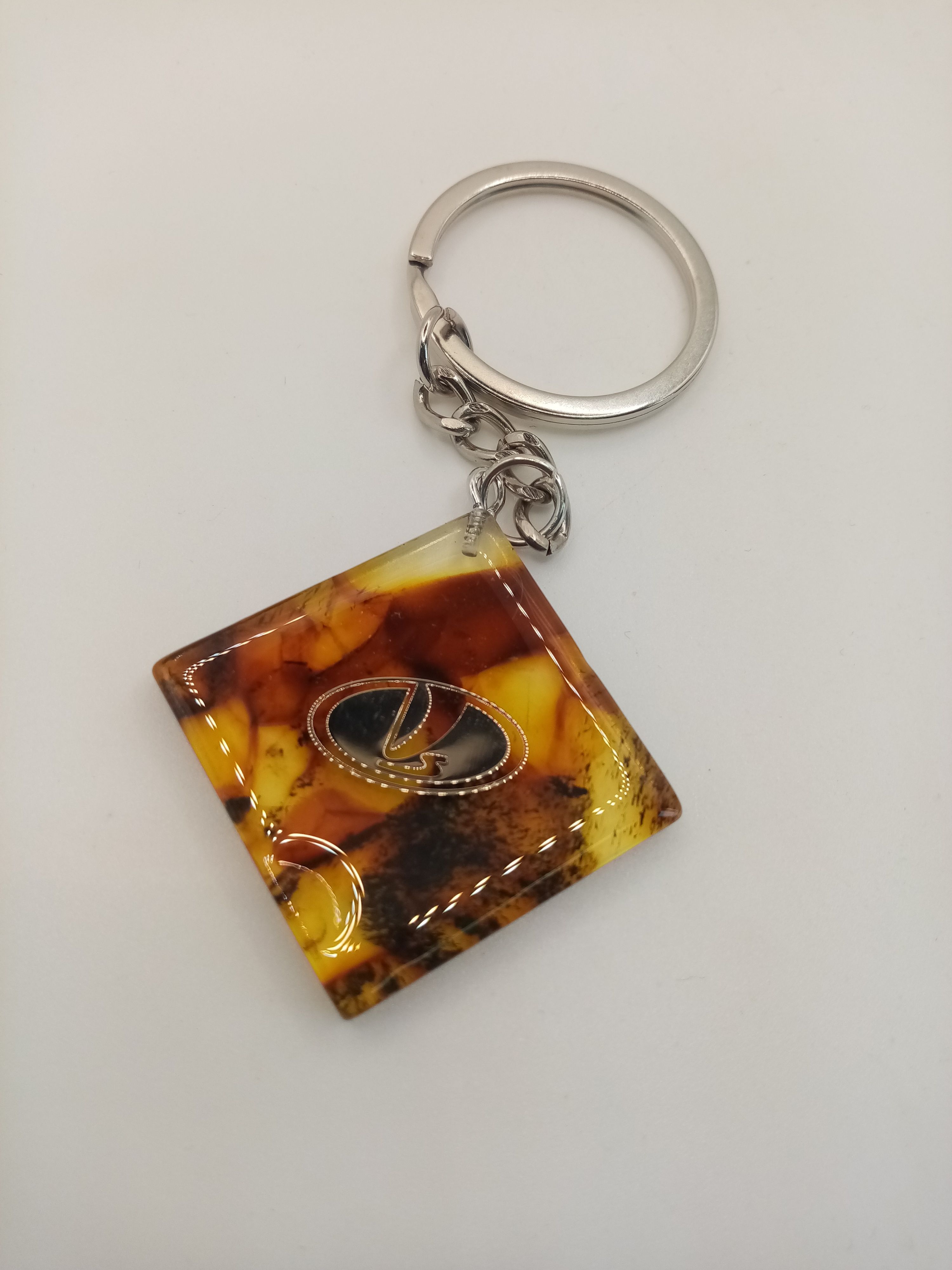 Брелок из натурального янтарного пресса без смолы , металлизированная наклейка , сверху линза , чтобы наклейка со временем не стерлась .