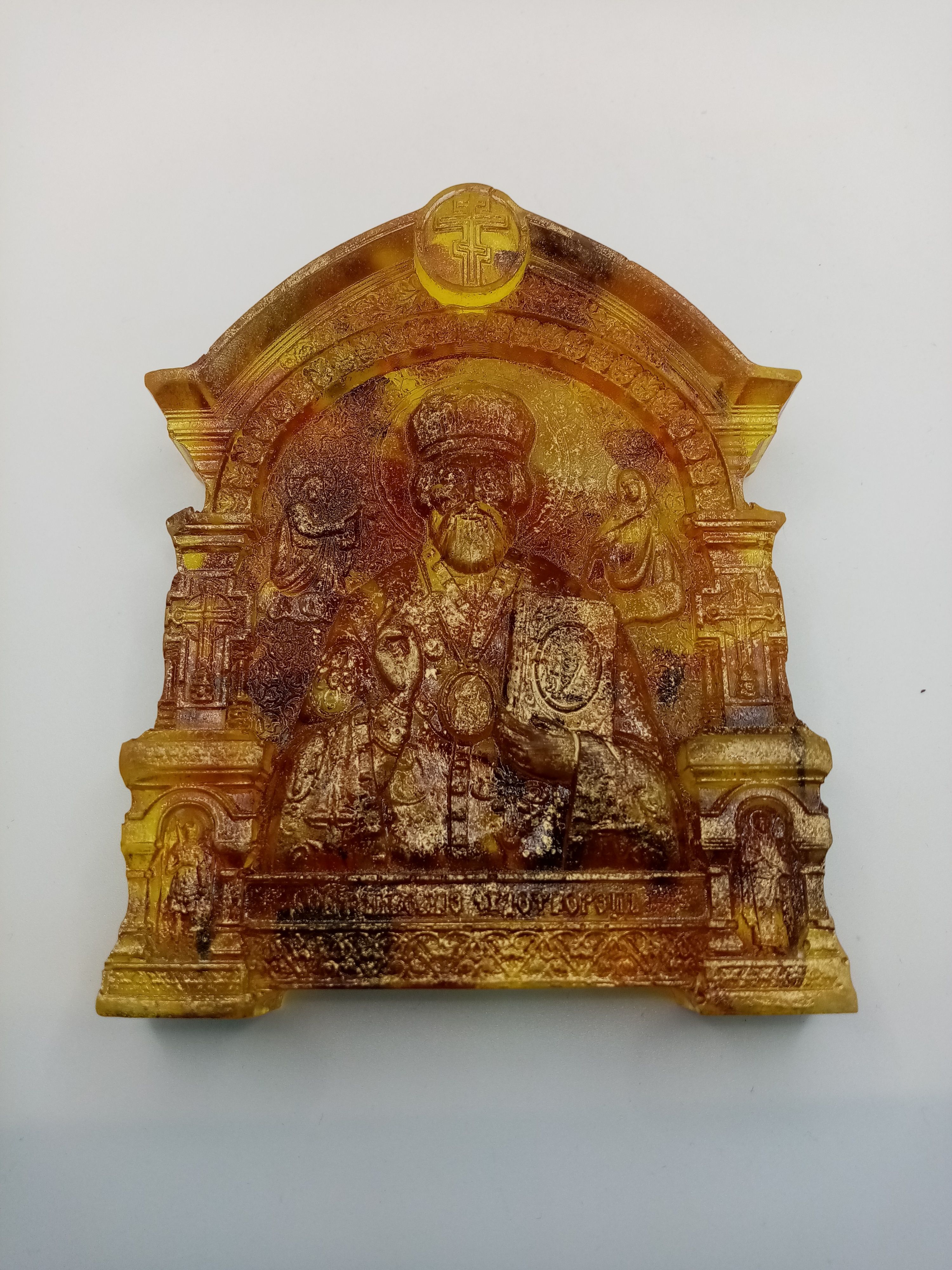 Ювелирная смола, натуральный янтарь. Размер иконы: высота 11 см., ширина 9 см., масса 157г.
