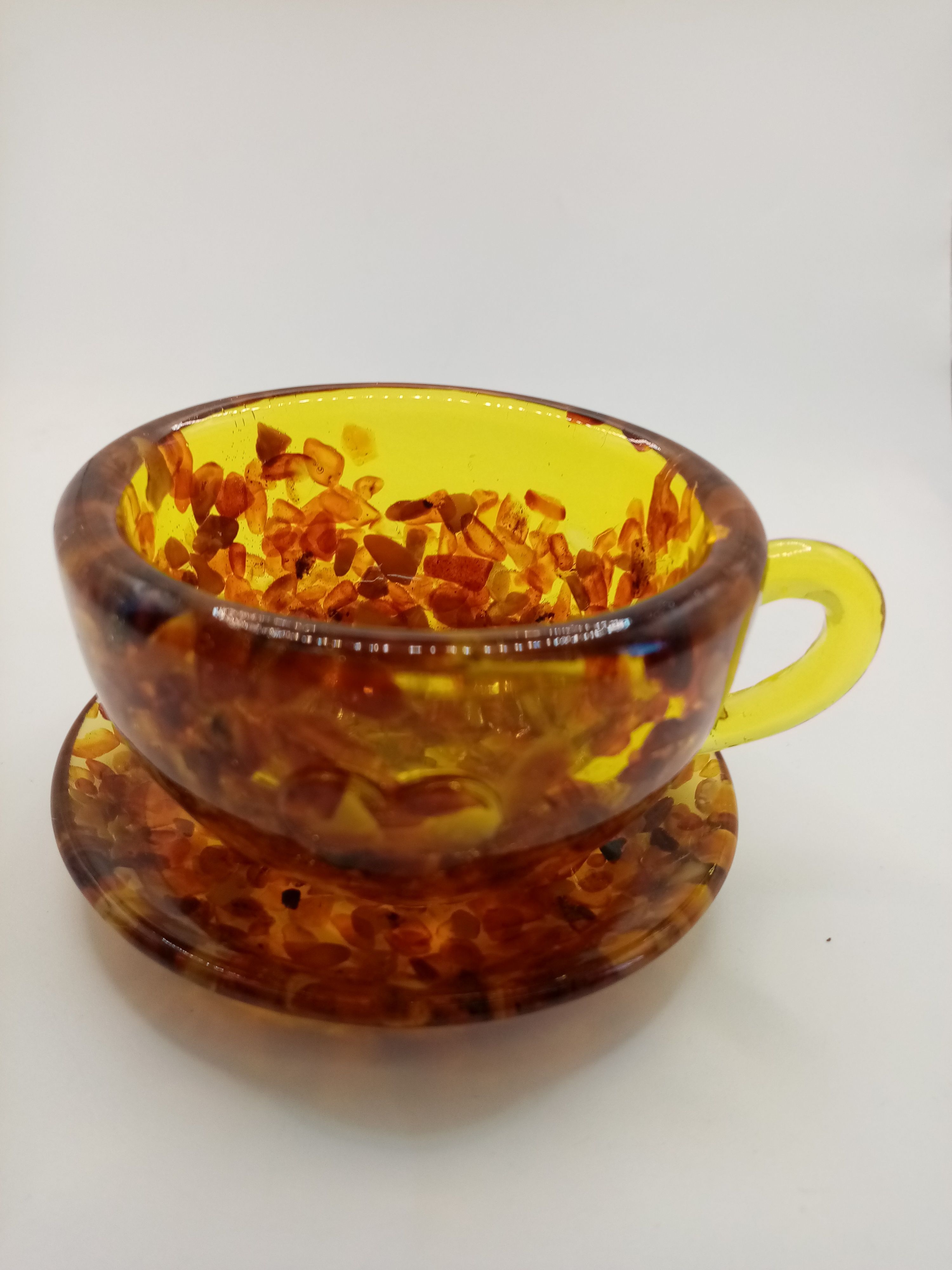 Вкомплекте: 1 чашка , 1 блюдце.Состав :ювелирная смола , янтарь. Размер чашки 4*7 см., блюдце 9,5*0,5 см., общая масса 126г.