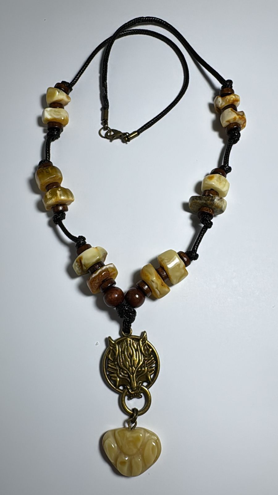 янтарь, деревянные бусины, металлическая фурнитура с покрытием