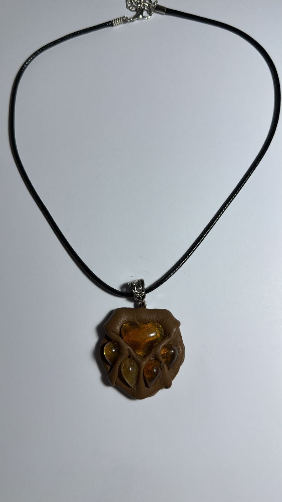 янтарь, кожа, металлическая фурнитура с покрытием