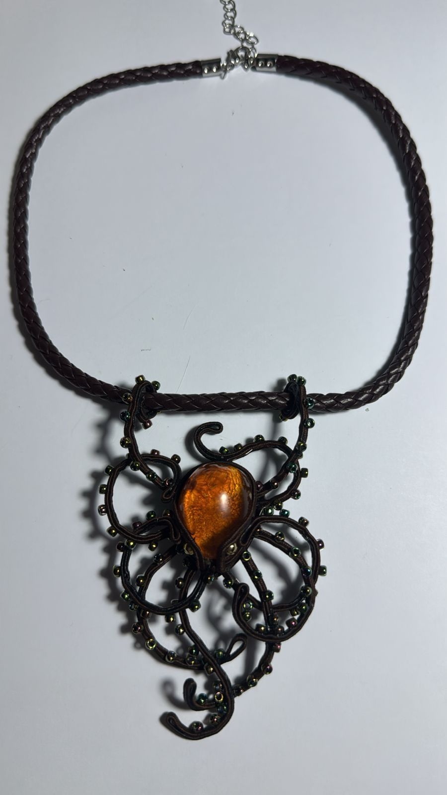 янтарь с инклюзом, сутажная лента, бисер